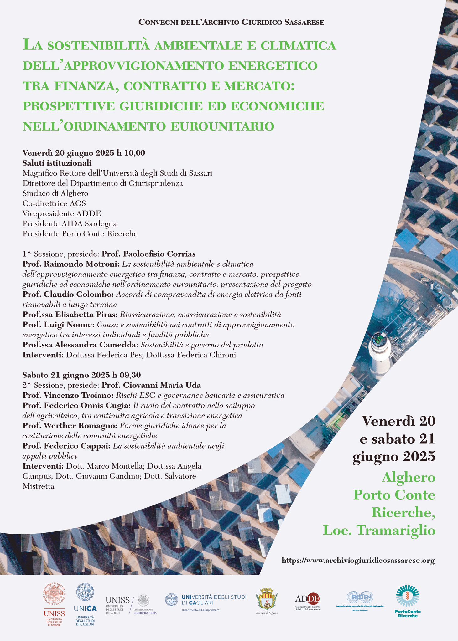 Nelle date 20 e 21 giugno 2025, si terrà ad Alghero, Porte Conte Ricerche, loc. Tramariglio, il Convegno dal titolo “La sostenibilità ambientale e climatica dell’approvvigionamento energetico tra finanza, contratto e mercato: prospettive giuridiche ed economiche nell’ordinamento eurounitario”, patrocinato, tra l’altro, da Aida Sezione Sardegna.