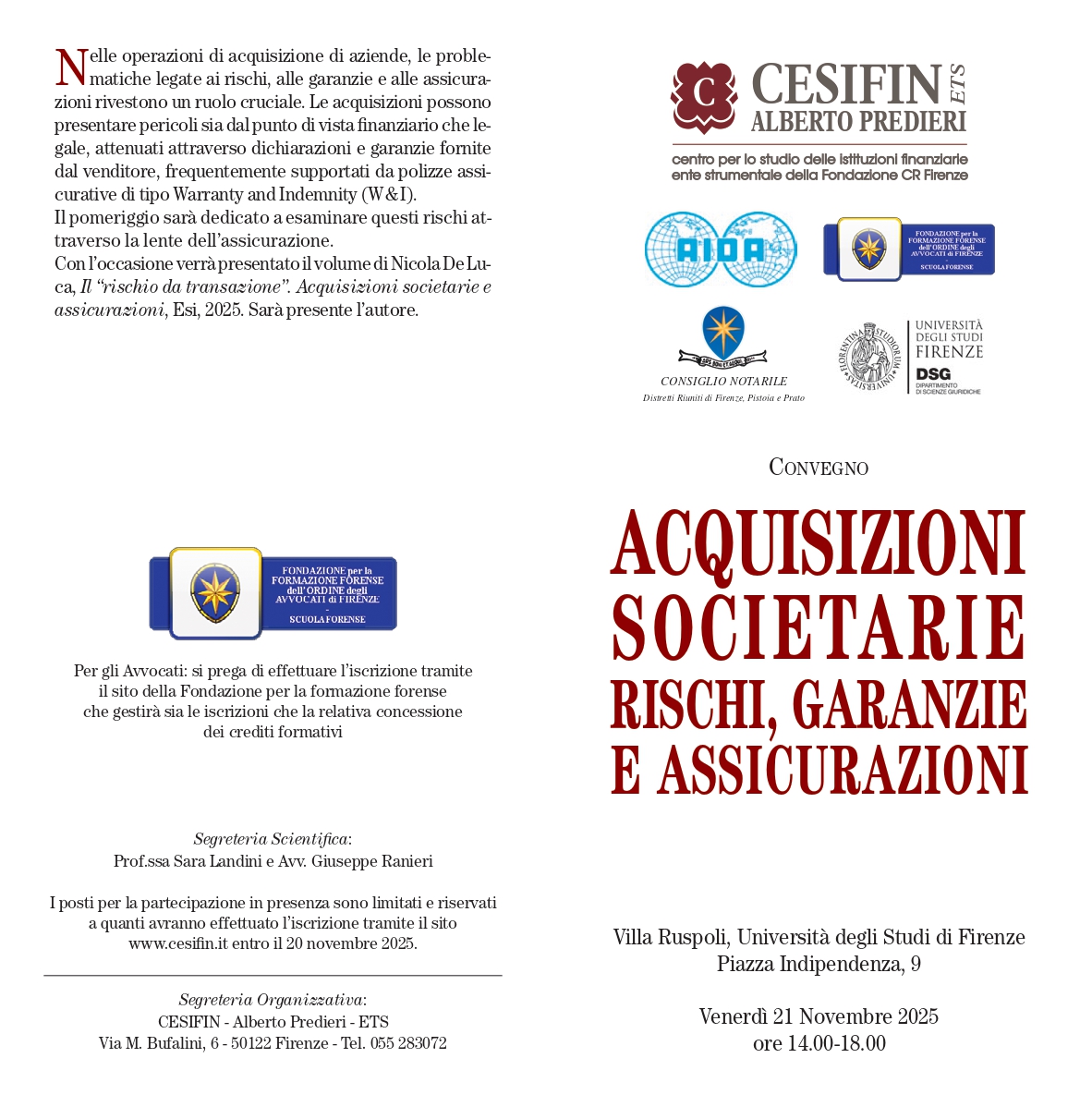 I posti per la partecipazione in presenza sono limitati e riservati a quanti avranno effettuato l’iscrizione tramite il sito www.cesifin.it entro il 20 novembre 2025.