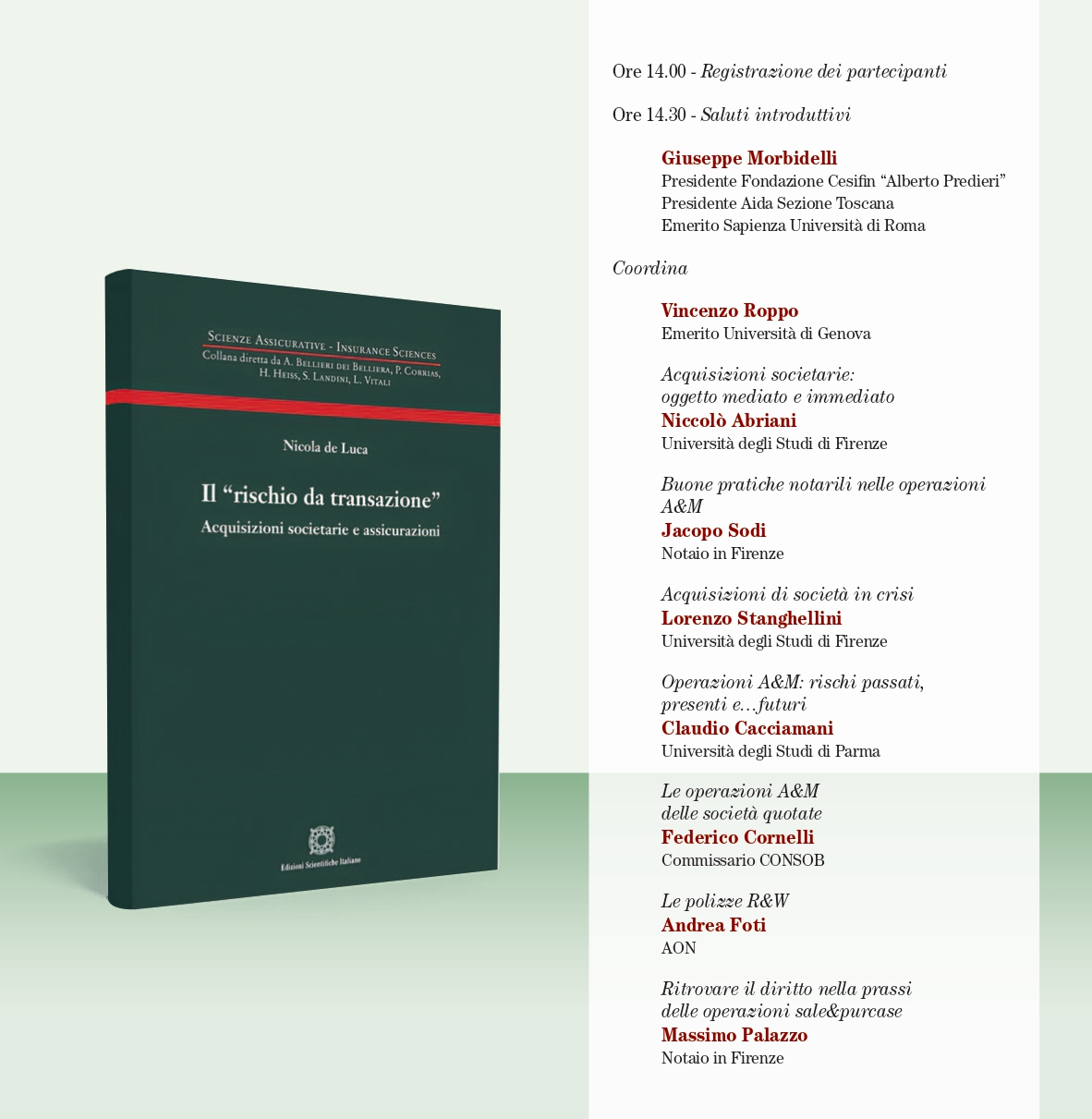 Con l’occasione verrà presentato il volume di Nicola De Luca, Il “rischio da transazione”. Acquisizioni societarie e assicurazioni, Esi, 2025. Sarà presente l’autore.