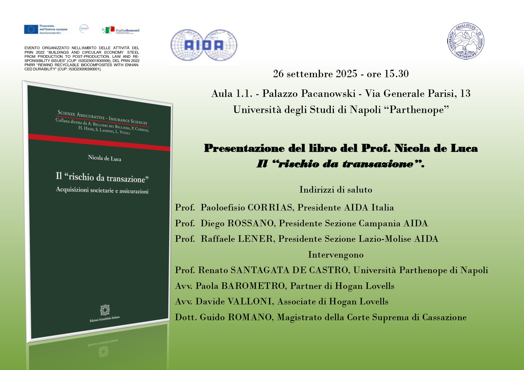 In data 26 settembre 2025, alle ore 15.30, presso l’Aula 1.1. – Palazzo Pacanowski, Via Generale Parisi, 13, Università degli Studi di Napoli “Parthenope”, si terrà la Presentazione del libro del Prof. Nicola de Luca Il “rischio da transazione”, organizzato, tra gli altri, da AIDA Sezione Campania.