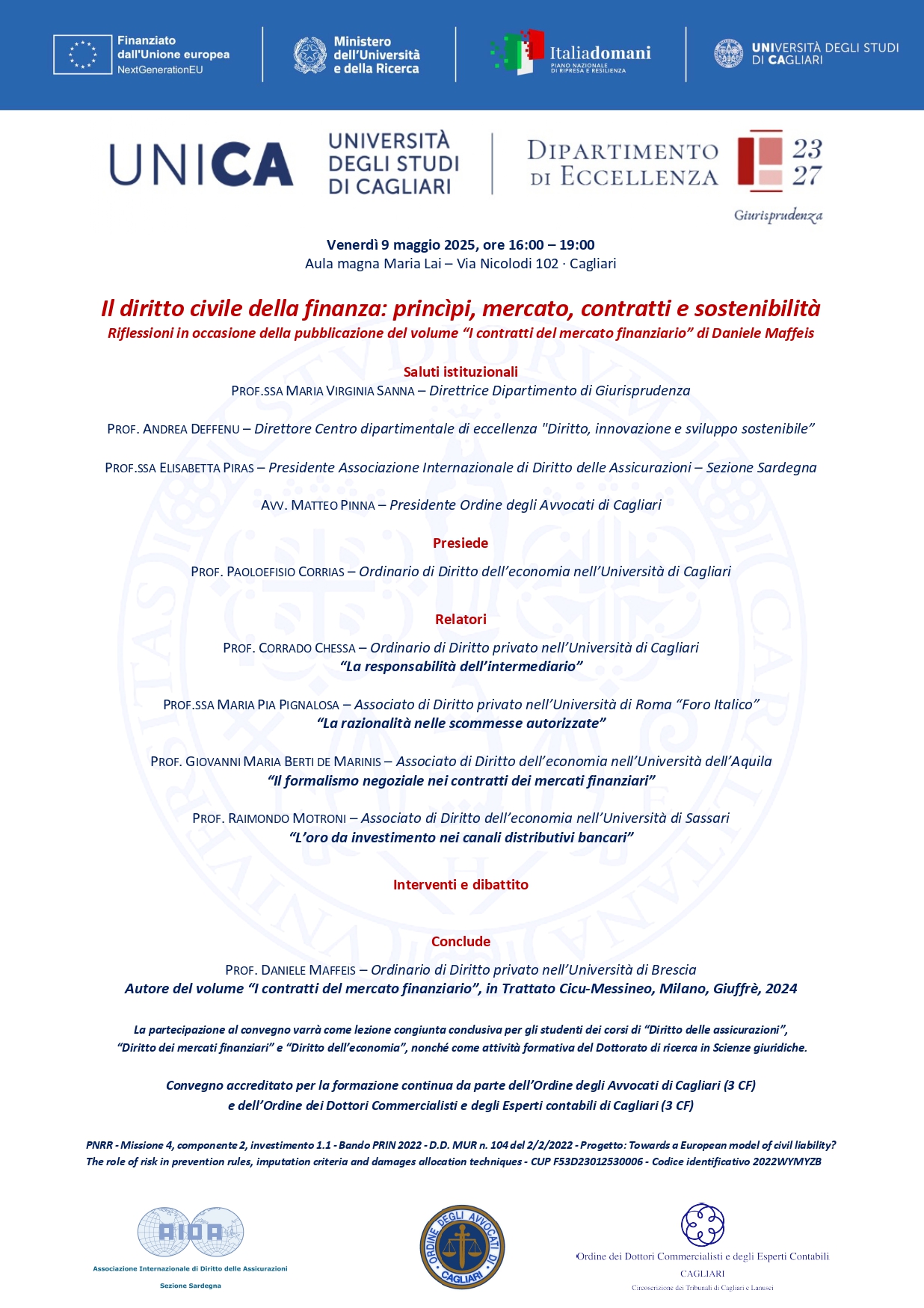 In data 9 maggio 2025, presso l’Università degli Studi di Cagliari (Aula magna Maria Lai, Via Nicolodi 102, Cagliari), si terrà il convegno dal titolo “Il diritto civile della finanza: princìpi, mercato, contratti e sostenibilità. Riflessioni in occasione della pubblicazione del volume “I contratti del mercato finanziario” di Daniele Maffeis”, patrocinato, tra l’altro, da AIDA-Sezione Sardegna.