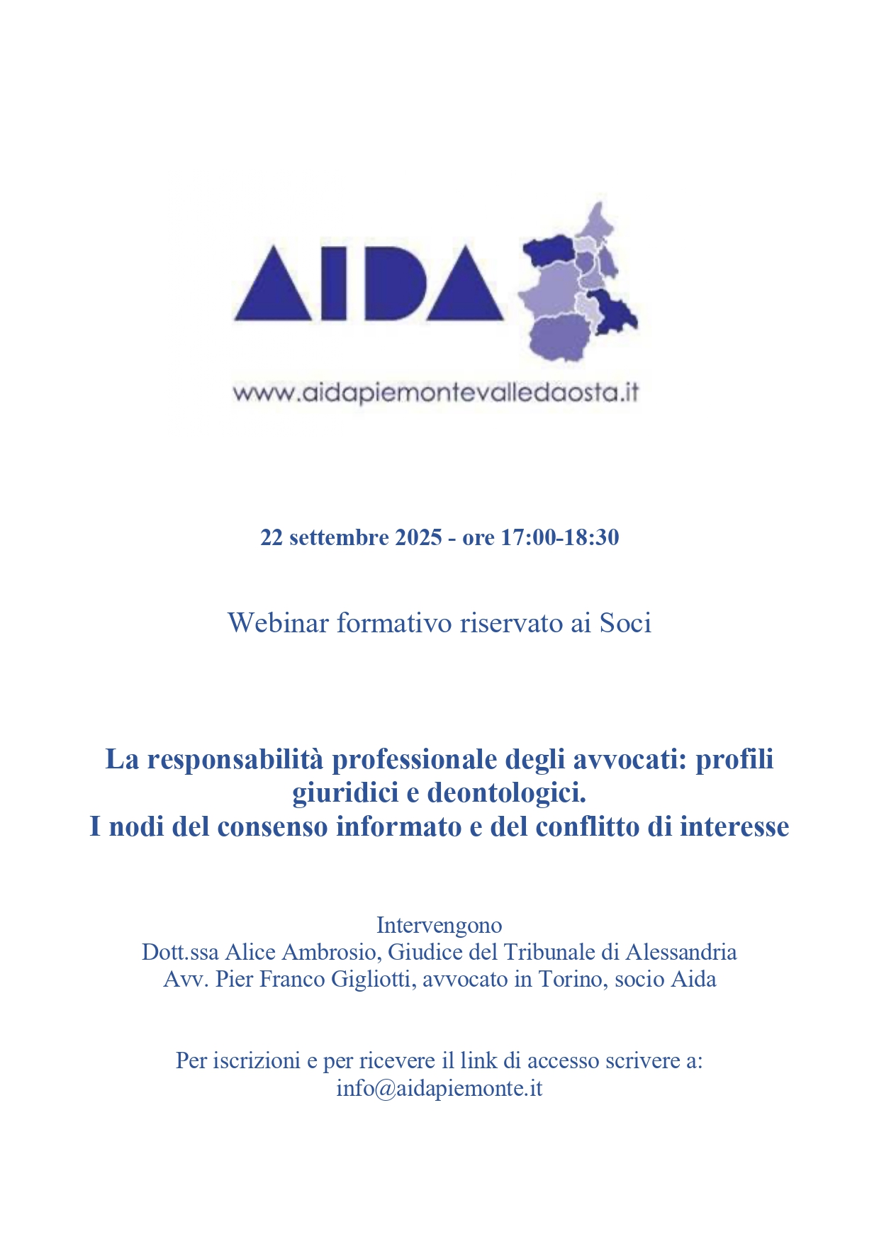 In data 22 settembre 2025, ore 17:00-18:30, si svolgerà il Webinar formativo dal titolo “La responsabilità professionale degli avvocati: profili giuridici e deontologici. I nodi del consenso informato e del conflitto di interesse” organizzato da AIDA Sezione Piemonte-Valle d’Aosta e riservato ai Soci.